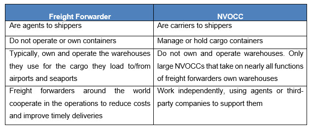 - An NVOCC acts as a middleman between the shipper and the vessel operator and also issues its bills of lading. Whereas, a freight forwarder is authorized by the shipper to act and make decisions on their behalf.